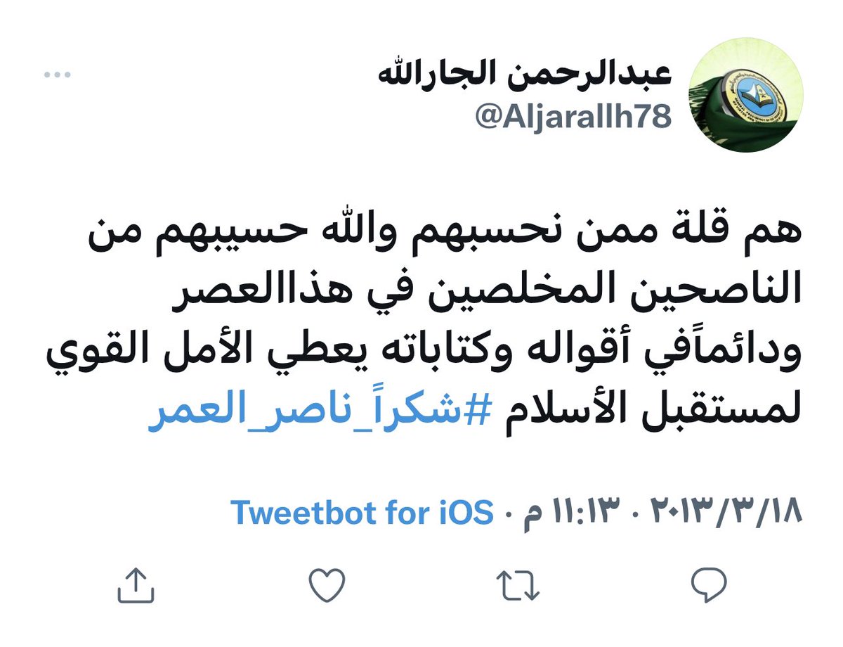 وجدت في حساب عبدالرحمن الجارالله العضيب معلم المرحلة الثانوية وإمام وخطيب جامع بن عقيل بالزلفي هذه التغريدة التي يوجه بها شكره لشيخ الشر والفتنة ناصر العمر