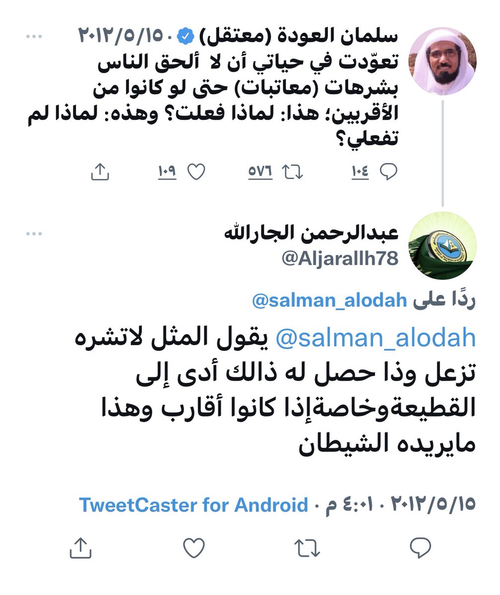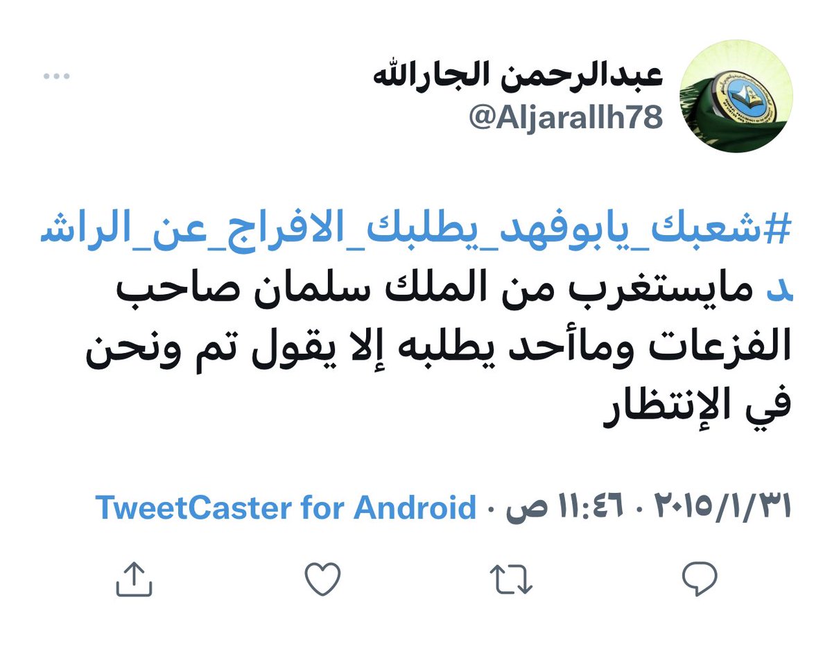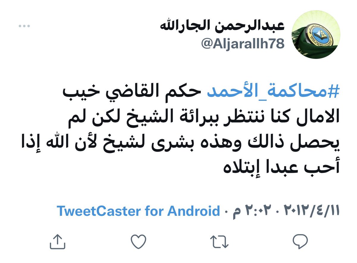 وجدت في حساب عبدالرحمن الجارالله العضيب معلم المرحلة الثانوية وإمام وخطيب جامع بن عقيل بالزلفي عدد من التغريدات التي فيها مناصرة للموقوفين الامنيين التكفيري الاحمد والارهابي الراشد