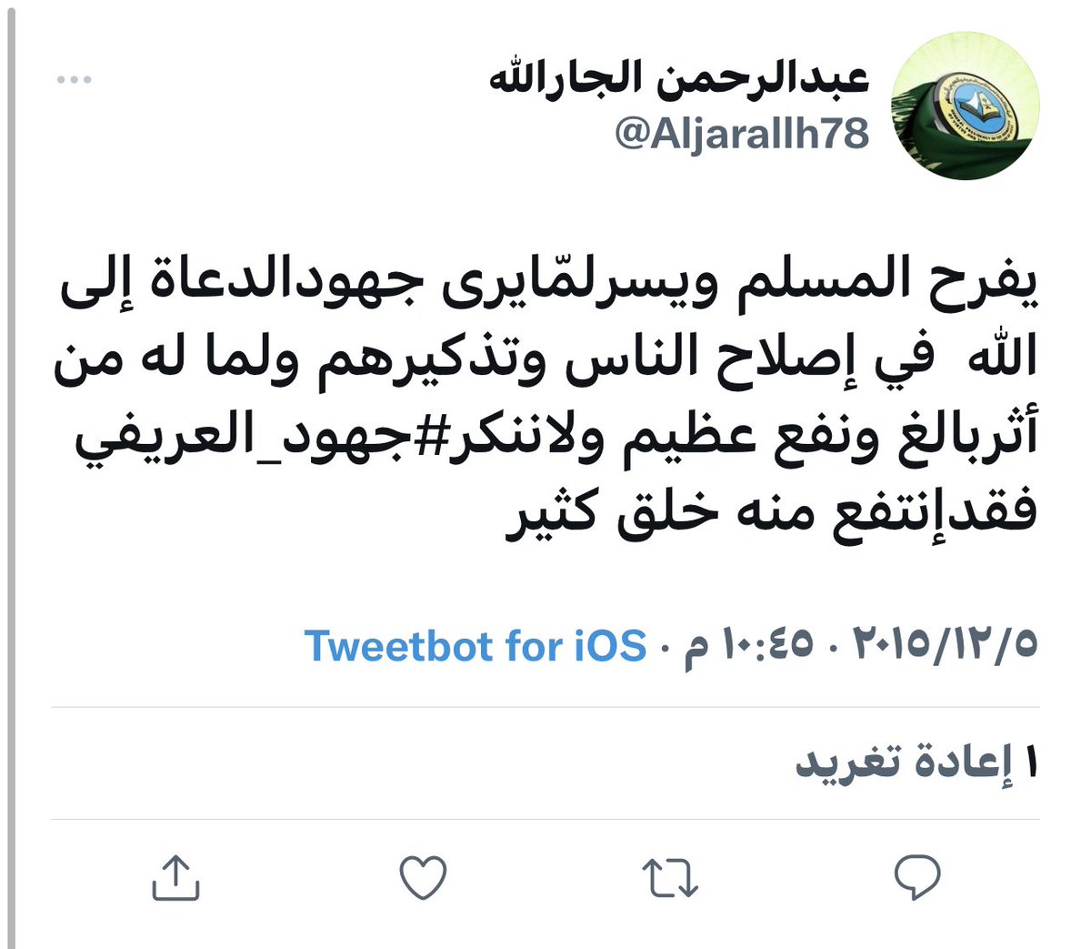 وجدت في حساب عبدالرحمن الجارالله العضيب معلم المرحلة الثانوية وإمام وخطيب جامع بن عقيل بالزلفي مشاركة في حملة لا لسب العريفي 😄