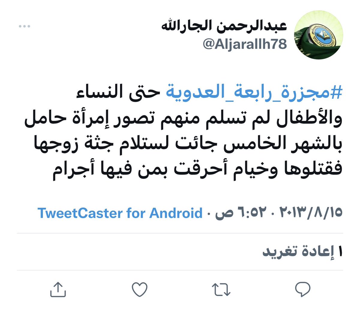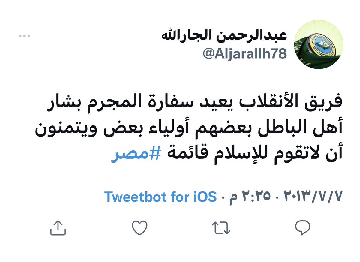 وجدت في حساب عبدالرحمن الجارالله العضيب معلم المرحلة الثانوية وإمام وخطيب جامع بن عقيل بالزلفي هذه التغريدات عن مصر وخوارج رابعة العدوية