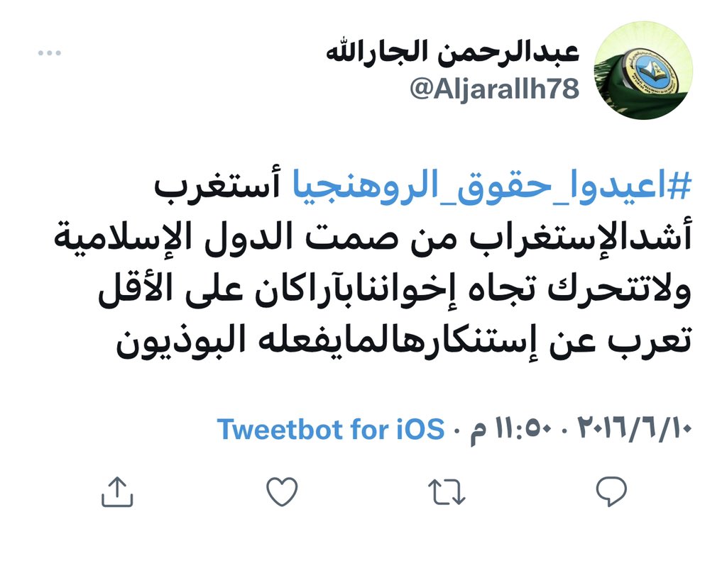 وجدت في حساب عبدالرحمن الجارالله العضيب معلم المرحلة الثانوية وإمام وخطيب جامع بن عقيل بالزلفي هذه التغريدة عن الروهنجيا