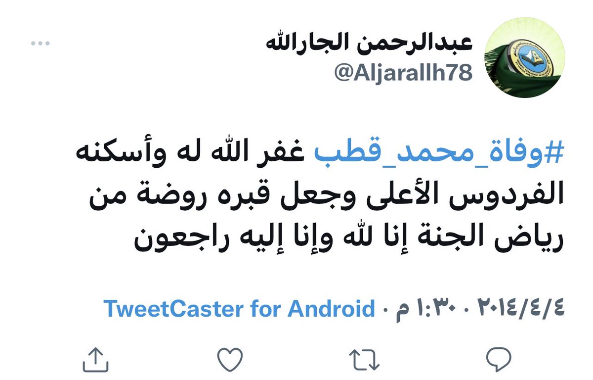 وجدت في حساب عبدالرحمن الجارالله العضيب معلم المرحلة الثانوية وإمام وخطيب جامع بن عقيل بالزلفي هذه التغريدة بعد وفاة محمد قطب