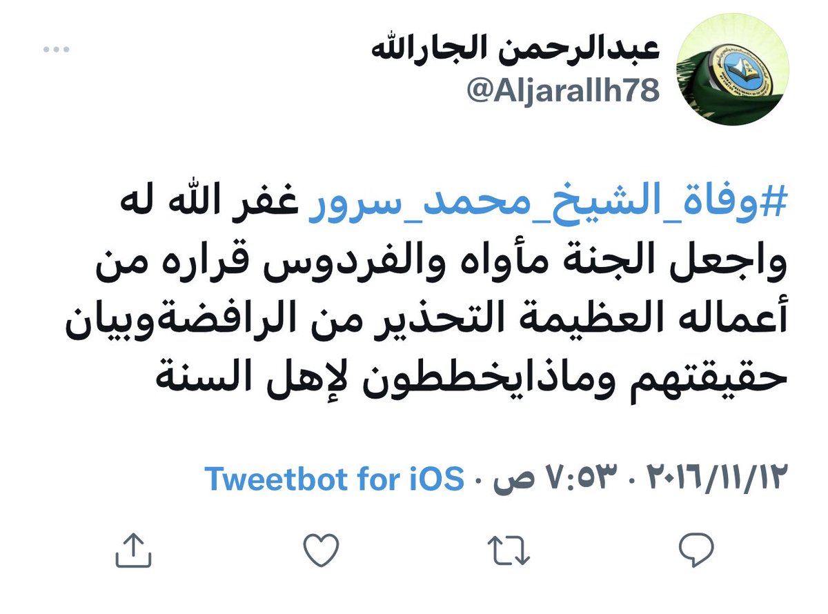 وجدت في حساب عبدالرحمن الجارالله العضيب معلم المرحلة الثانوية وإمام وخطيب جامع بن عقيل بالزلفي هذه التغريدة التي يترحم بها على من يكفرنا ويكفر حكام بلادنا محمد سرور عليه من الله ما يستحق