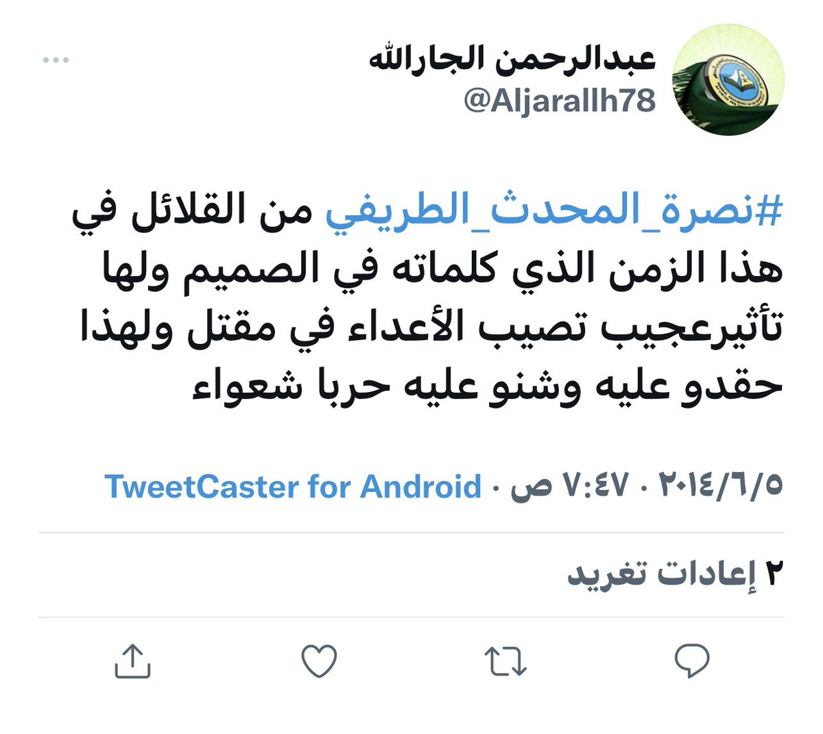 وجدت في حساب عبدالرحمن الجارالله العضيب معلم المرحلة الثانوية وإمام وخطيب جامع بن عقيل بالزلفي عدد اخر من التغريدات التي يدافع بها عن التكفيري الموقوف الامني عبدالعزيز الطريفي