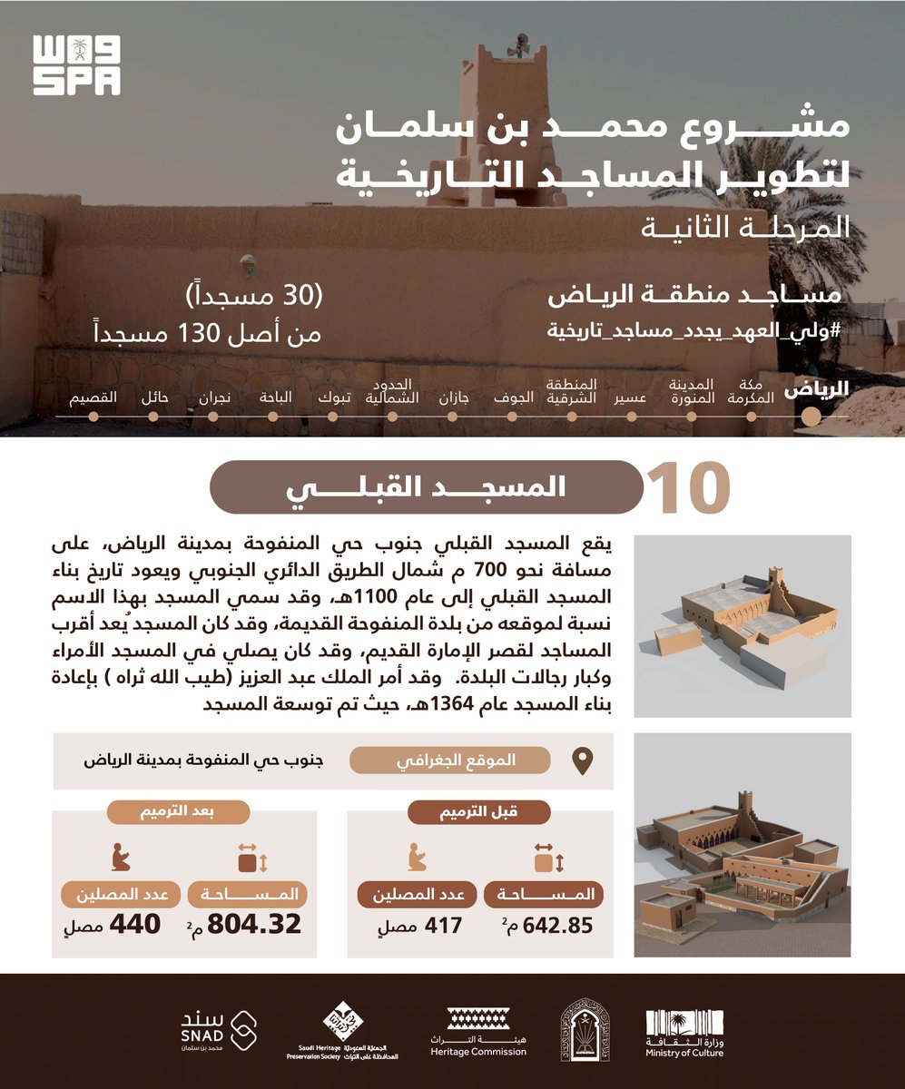 #انفوجرافيك | المسجد القبلي.. يعود تاريخ بنائه إلى عام 1100هـ، تقدر مساحته قبل الترميم بنحو 642.85 م²، فيما ستبلغ بعد التطوير 804.32 م².