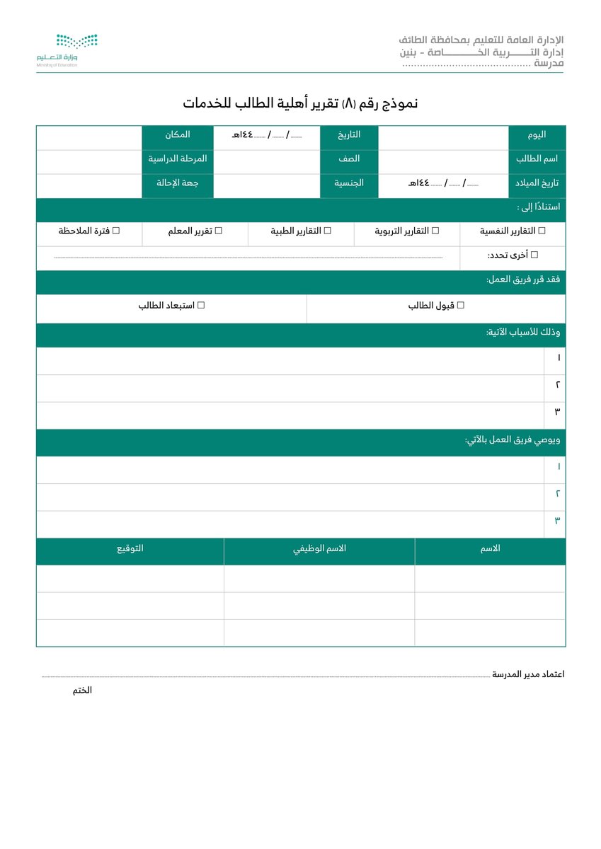 نموذج 8 تقرير أهلية الطالب للخدمات :