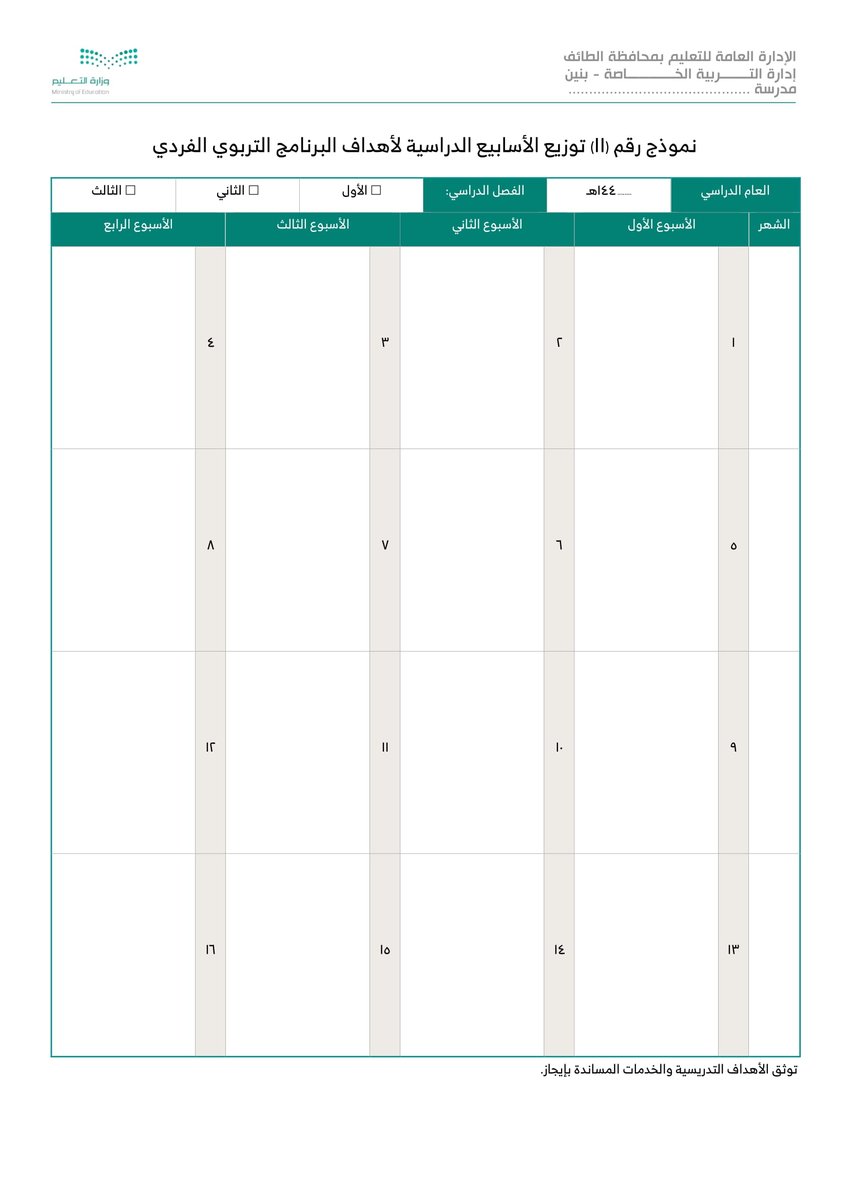 نموذج 11 توزيع الأسابيع الدراسية لأهداف البرنامج التربوي الفردي :