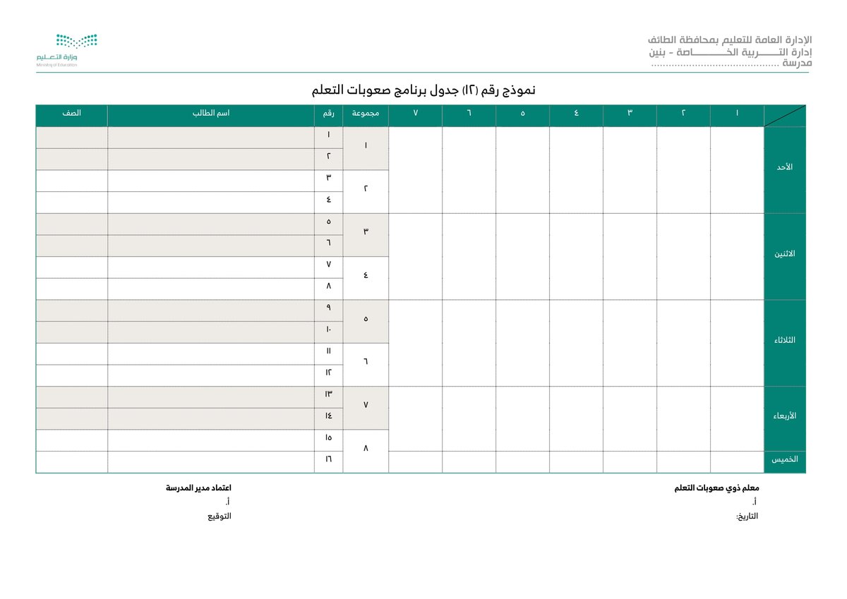 نموذج 12 جدول برنامج صعوبات التعلم :