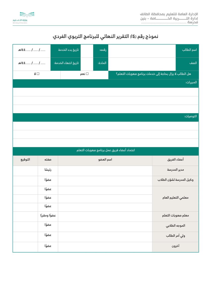 نموذج 14 التقرير النهائي للبرنامج التربوي الفردي :