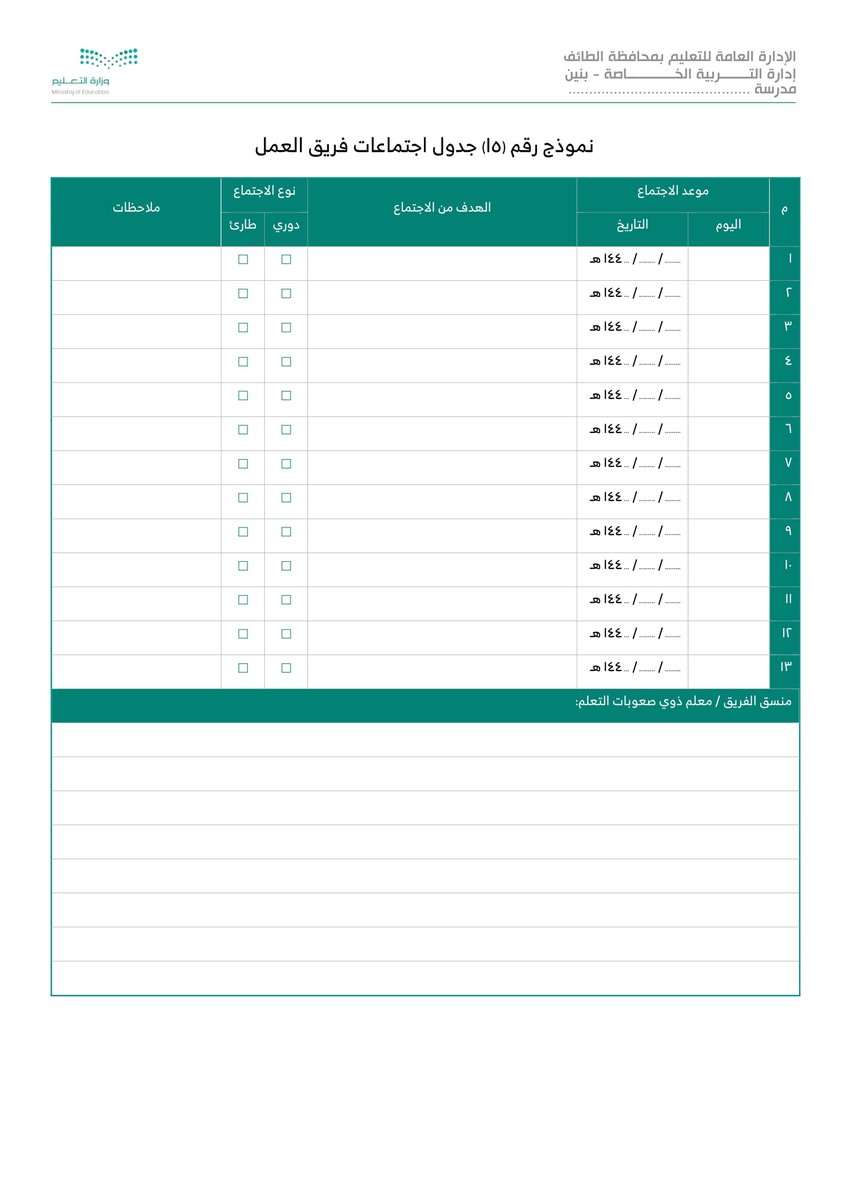 نموذج 15 جدول اجتماعات فريق العمل :