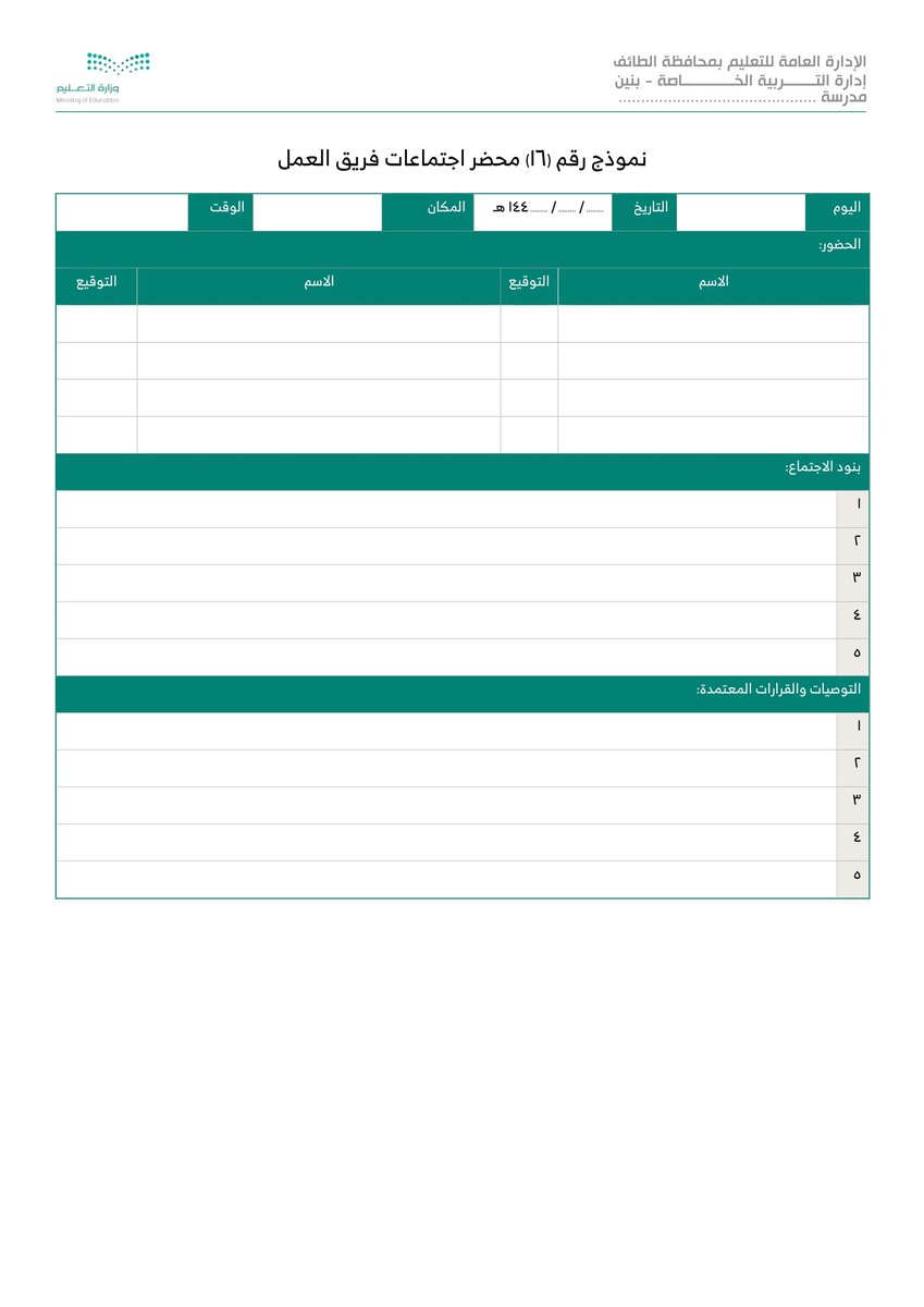 نموذج 16 محضر اجتماعات فريق العمل :