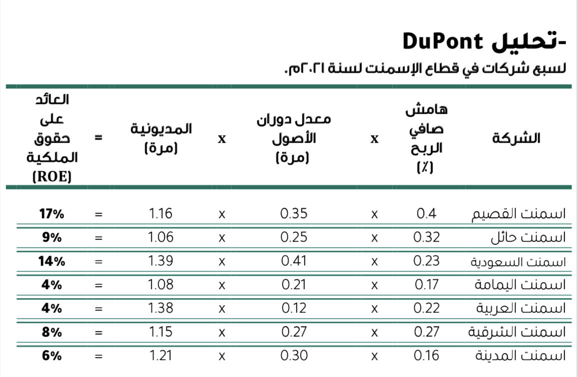 بالإضافة الى فحص العائد على حقوق الملكية باستخدام نموذج دوبو بوينت ومقارنته مع شركات الاسمنت المشابهة للشركة.