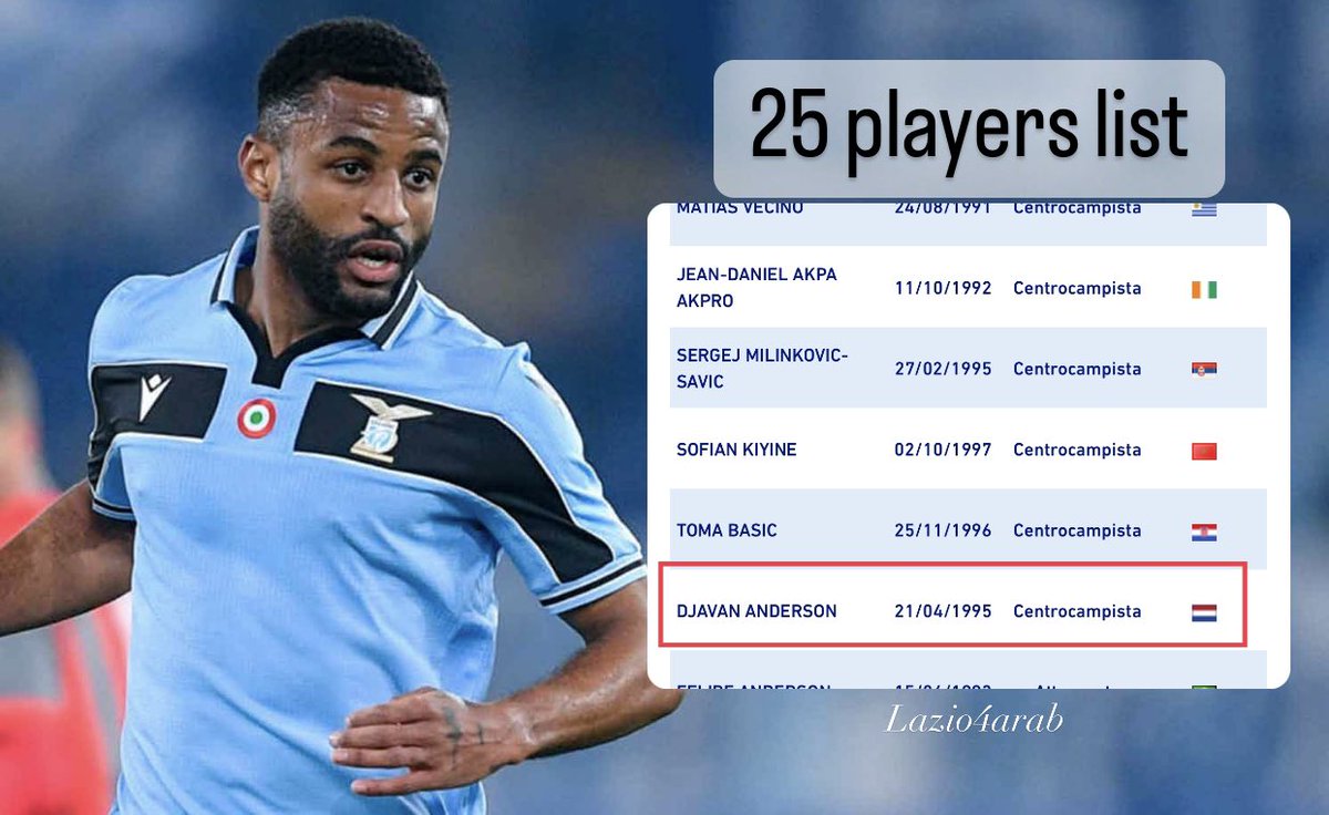 جافان اندرسون تم استدعاءه لمباراة سامبدوريا ويبدو انه لا توجد عروض للهولندي ومع زيادة عدد الدكة لـ ١٥ لاعب وسـ يستعمله ساري كـ لاعب طوارئ كما فعل سيموني انزاغي عند اصابة لوليتش ، الهولندي تم تسجيله بقائمة #لاتسيو بدلاً من اتشيربي الذي يقترب من الانتقال لـ انتر .