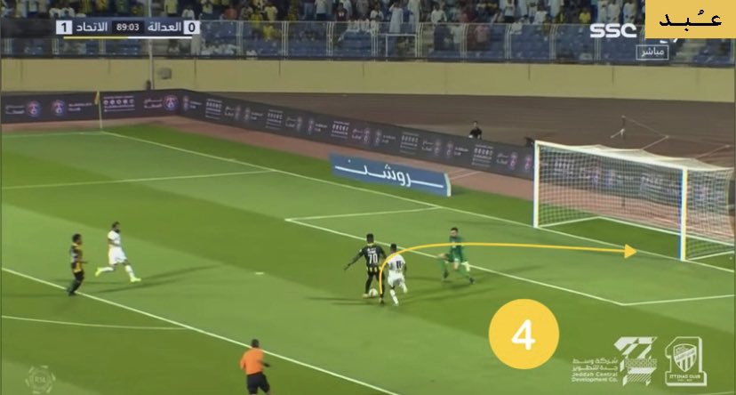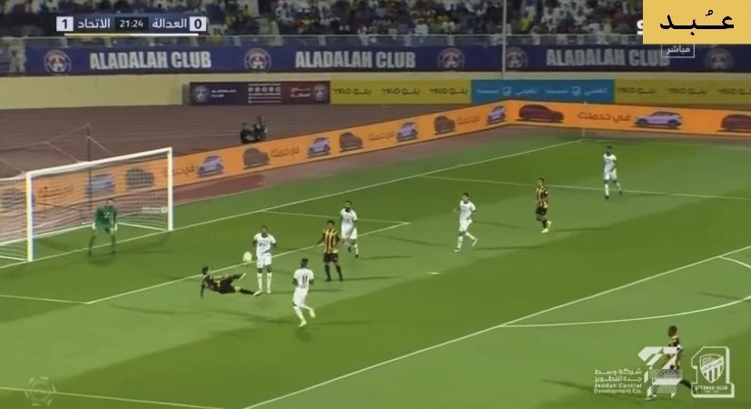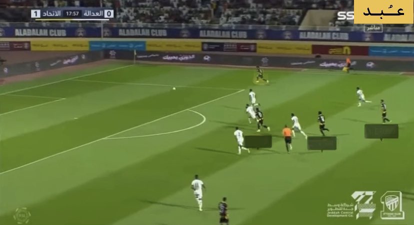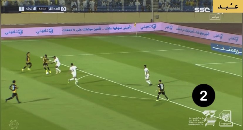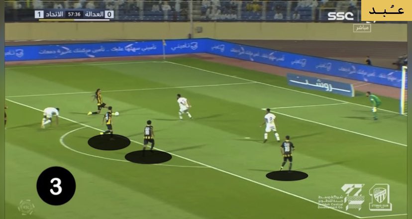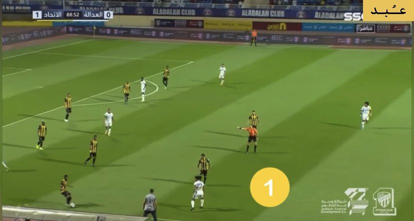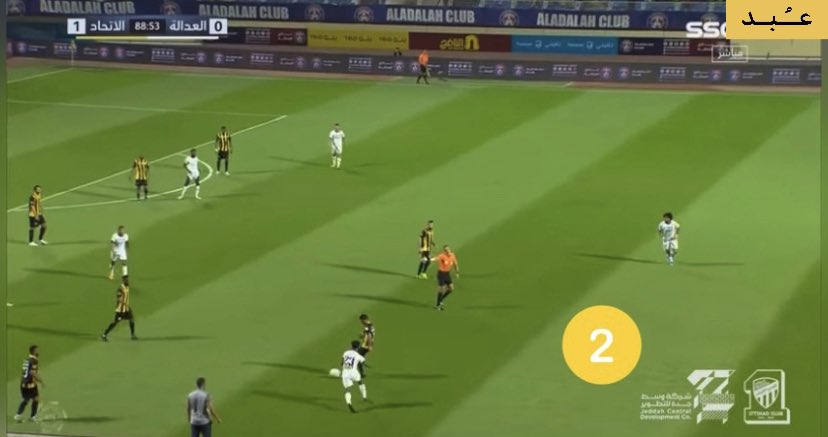 - نلاحظ أن عدد لاعبي #الاتحاد في الثلث الأخير يتواجد به لاعبان فقط ( العبود + رومارينيو ) ، إضافة لذلك لاعبي العدالة متقدمين، نظرًا لتواجد لاعبي الاتحاد بمناطق متوسطة