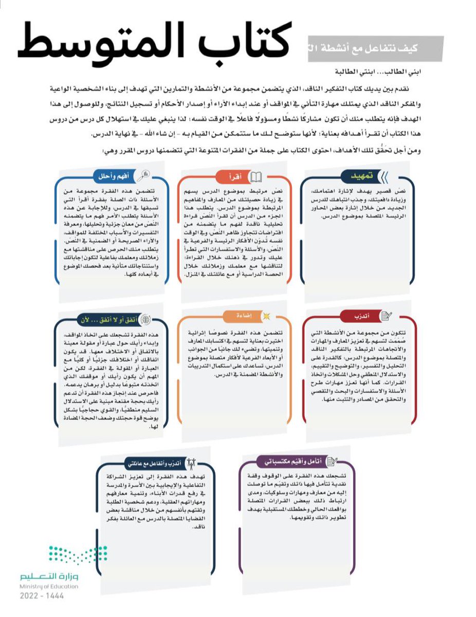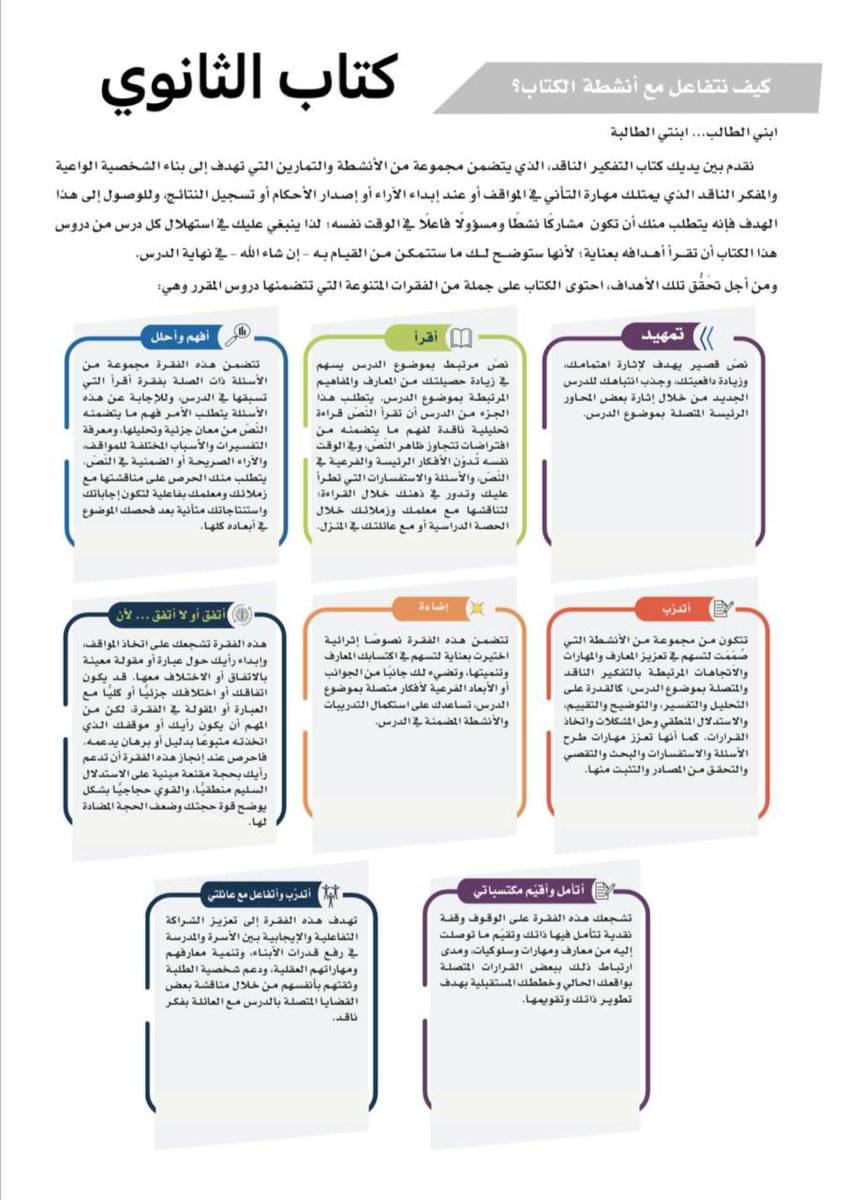 صفحات في كتاب #التفكير_الناقد للمرحلتين المتوسطة والثانوية من رأيي يجب على المعلم/ـة ألا يتجاوزها قبل البدء بالدروس لينجح في تحقيق أهداف المادة، ولتيسيرها على الطالب/ـة