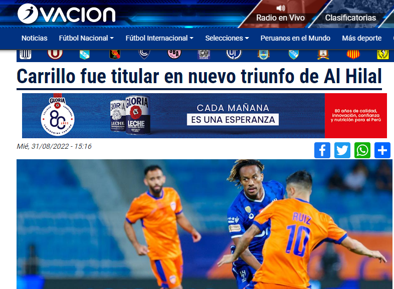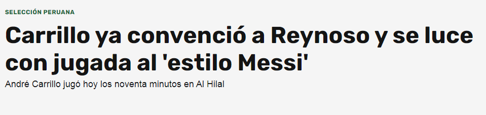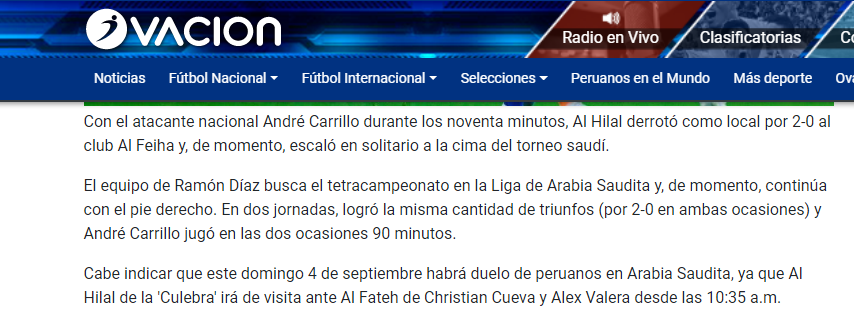 💥💥 صحيفة "ovacion" البيروفية: "شارك أندريه كاريلو بصورة أساسية في مباراة #الهلال مع الفيحاء، حيث فاز فريقه 2-0 وصعد إلى صدارة البطولة السعودية في الوقت الحالي بعد تحقيقه انتصارين متتاليين.. يسعى فريق رامون دياز للحصول على لقب الدوري السعودي للموسم الرابع على التوالي".