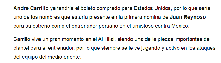 💥💥 صحيفة "elfutbolero" البيروفية: "استعرض محترف #الهلال أندريه كاريلو مهارته في مباراة الفيحاء "بأسلوب ميسي".. اللاعب سيكون ضمن خيارات مدرب بيرو خوان رينوسو بالفترة المقبلة في اللقاء الودي أمام المكسيك.. كاريلو يعيش لحظات رائعة مع الهلال وهو أحد القطع المهمة في تشكيلة فريقه".