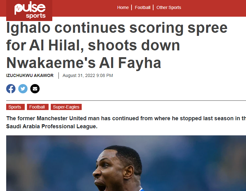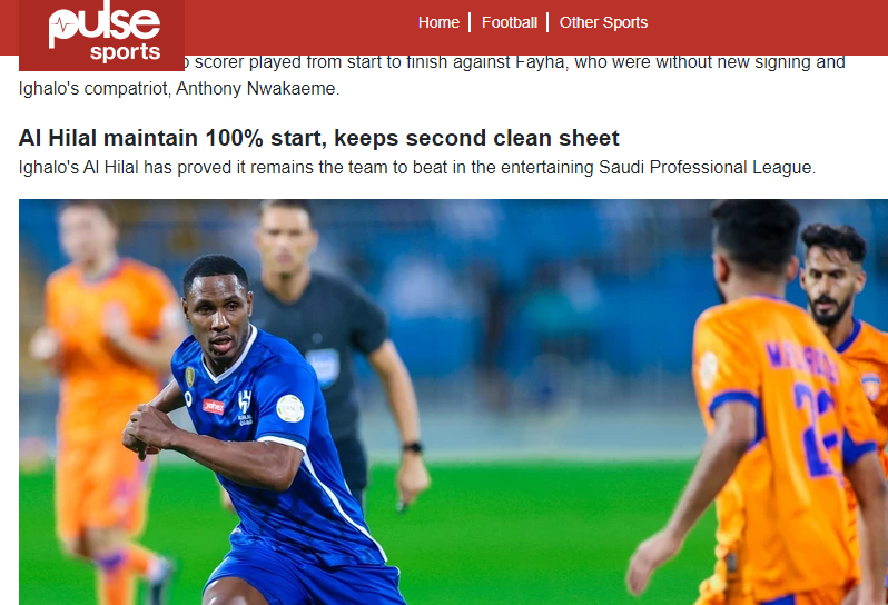 💥💥 صحيفة "pulse" النيجيرية: "يواصل إيغالو التهديف لصالح #الهلال.. افتتح ماريغا التسجيل قبل أن يحسم إيغالو الفوز بالهدف الثاني.. فاز الهلال الآن في أول مباراتين وسجل 4 أهداف وحافظ على شباكه نظيفة. سجل إيغالو في كلتا المباراتين ليقود حامل اللقب إلى صدارة جدول الترتيب بـ6 نقاط".
