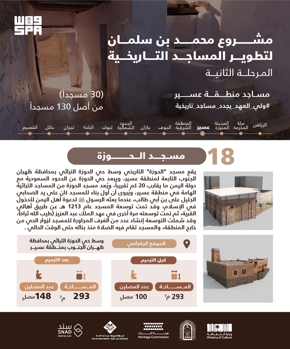 #انفوجرافيك | مسجد الحوزة تبلغ مساحته قبل وبعد الترميم 293 م²، فيما سترتفع طاقته الاستيعابية بعد التطوير من 100 مصلٍ إلى 148 مصلياً.