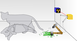 المنطق بيقول إنها إما عايشة أو ميتة ولكن طبقًا لميكانيكا الكم فلحد قبل ما تفتح الصندوق فالقطة عايشة وميتة في نفس الوقت، لكن وقت ما تفتح الصندوق فأنت هتشوف احتمال واحد بس وهو إن القطة يا عايشة يا ميتة، ولحد ما تفتح الصندوق فالقطة في حالة مبهمة من الاحتمالات.