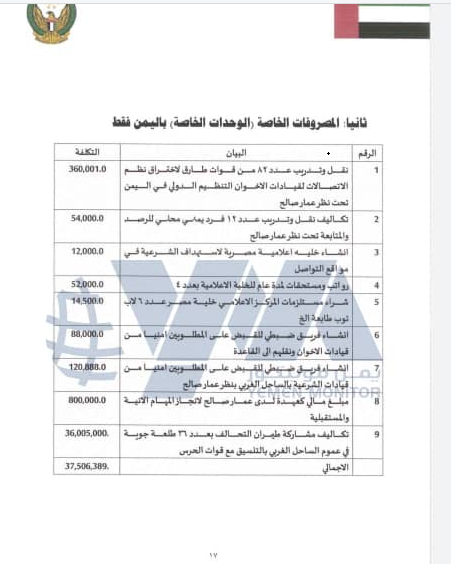 بالإضافة لإنشاء خلية إعلامية مصرية لاستهداف الشرعية في مواقع التواصل بتكلفة 12 ألف دولار، ورواتب سنوية 52 ألف دولار، ومستلزمات للمركز الإعلامي في مصر ب14500 دولار.