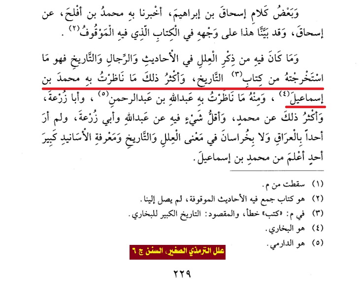 2/ على مَن بحث في تاريخ هذا اللقاء بينهما لمعرفة الترتيب الزمني لأقوال البخاري وما إذا كان هناك تغير في الاجتهاد أم لا. والذي خصلت إليه من دراسة تواريخ هذه الحقبة التي عاش فيها البخاري أن الترمذي لقيه قبل خرجته الأخيرة إلى العراق في أربعينيات القرن الثالث