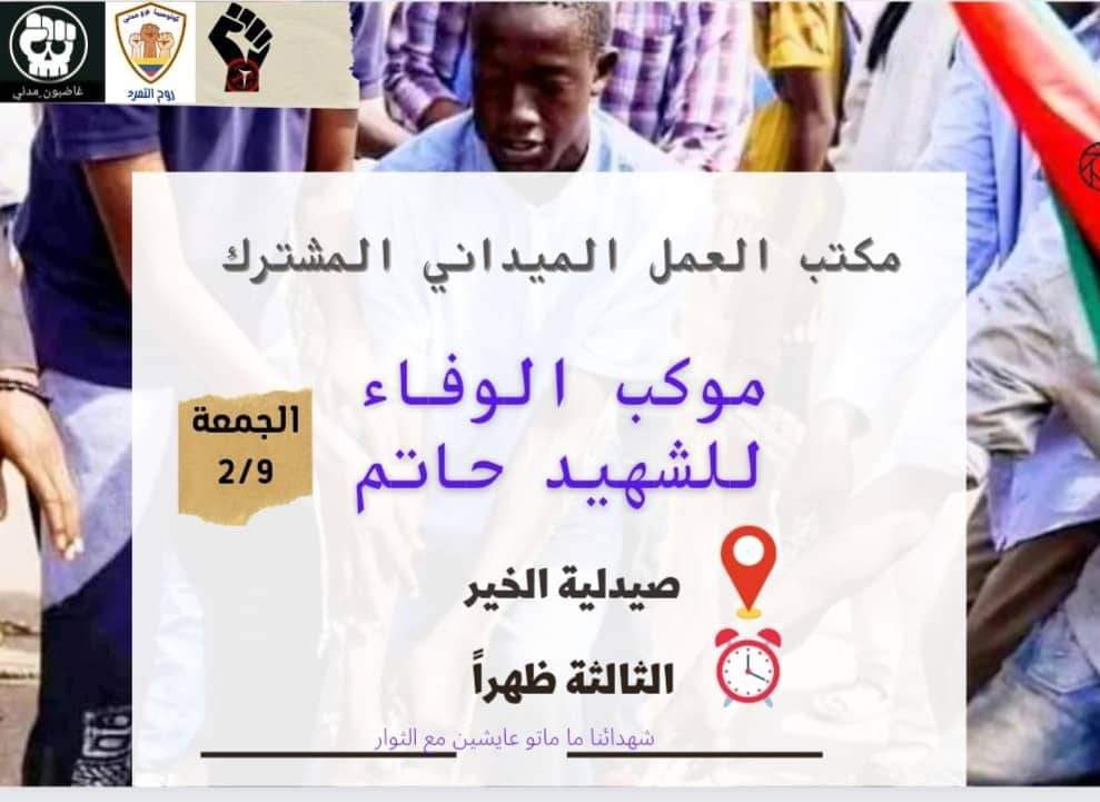 الفتى غض الاهاب حاتم نجم الدين "١٩" عاماً، الذي دهسته عربات الموت التابعة للسلطة الانقلابية عقب اصابته بالبمبان؛ فأرتقى شهيداً آخر مثل رفاقه قاسم و محمد فيصل و بقية العقد الفريد من ابناء ودمدني.