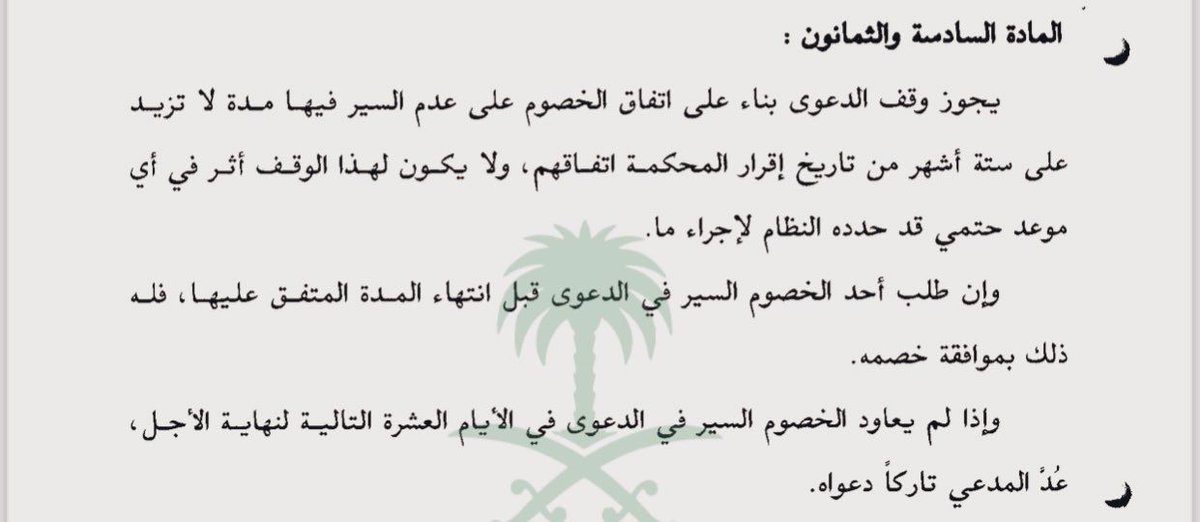 3/ وعلّة ذلك أن فكرة الوقف تتنافى مع فكرة الاستعجال التي بُني عليها هذا النوع من الدعاوى أصلاً. وقد أورد نظام المرافعات الشرعية باباً يتحدث عن "وقف الخصومة"، وأقر في المادة 86 -المرفقة- بفكرة الوقف الاتفاقي وهو الذي يكون بناءً على اتفاق الخصوم بحسب الشروط التي فصلها النظام.