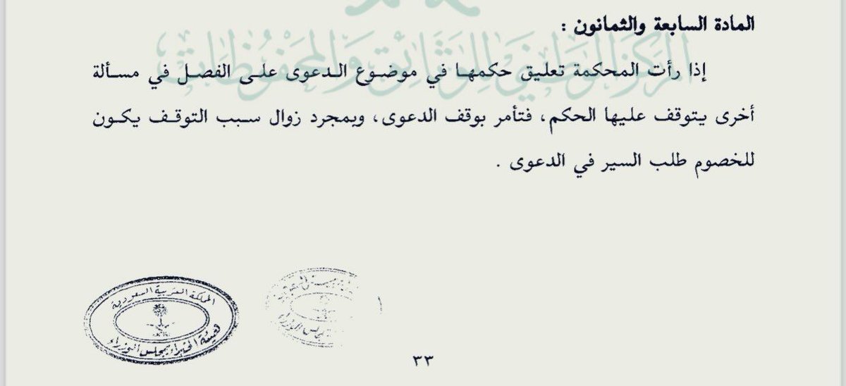 4/ ومن صور "وقف الخصومة" التي أقرها النظام أيضاً الوقف الذي يكون بقوة النظام، وهو ماجاء بالمادة 87 -المرفقة-، وهو ذلك الوقف الذي تأمر به المحكمة عندما ترى أن حكمها بموضوع الدعوى التي أمامها متعلق على الفصل بمسألة أخرى يتوقف عليها الحكم فتأمر حينها بوقف الدعوى لحين زوال هذا السبب.