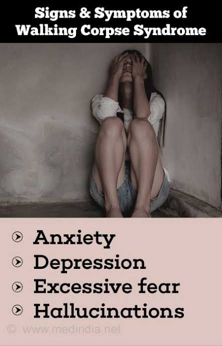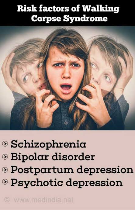 ولأنك بتحس إنك ميت؛ فده ممكن يسبب مضاعفات خطيرة، بعض الناس بتبطل الأكل والشرب فبيحصلهم جفاف وسوء تغذية، وبعضهم بيبطل يستحمى والناس بتبدأ تبعد عنهم، وبعضهم بيلجأ للانتحار لإثبات إنهم ماتوا وممكن يموتوا تاني، وبعضهم بيعتقد إنهم هيرتاحوا لو ماتوا تاني.