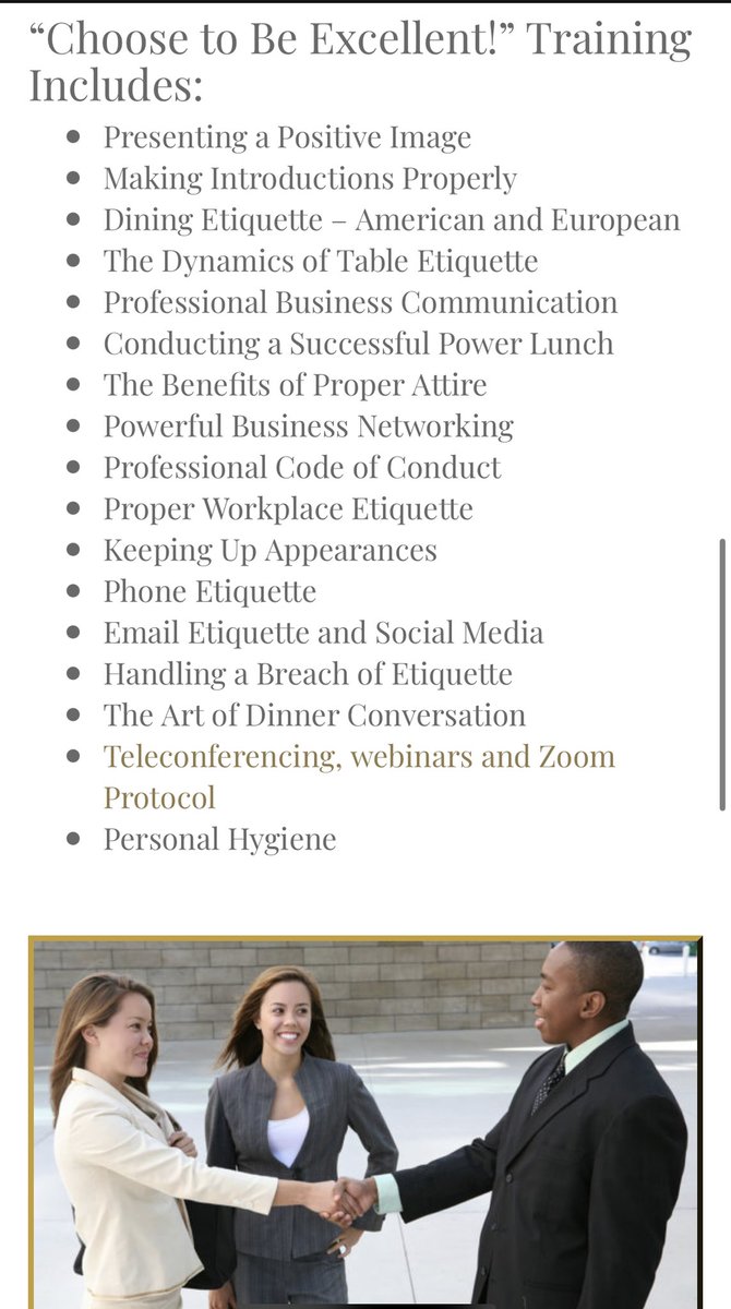 - تزخر المكتبة الانجليزية بكتل ودورات عن بعد للتدريب على الاتكيت المهني.