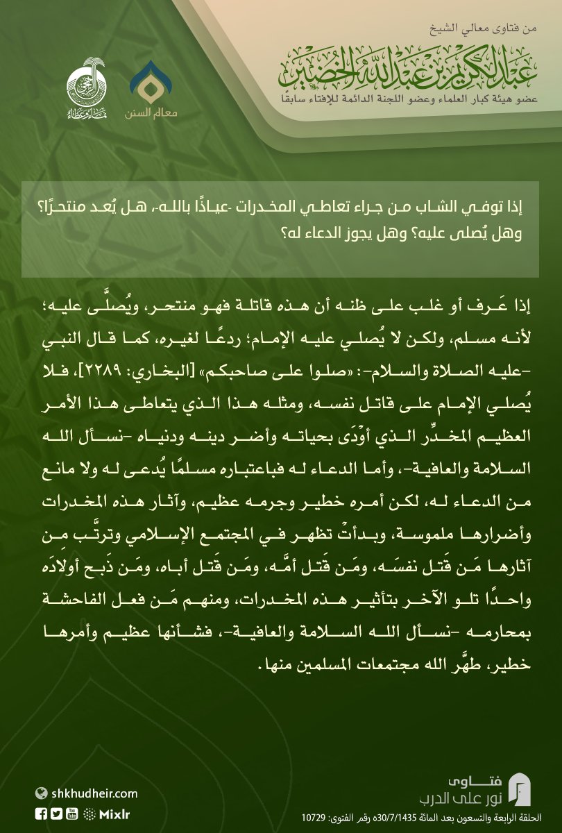 إذا توفي الشاب من جراء تعاطي المخدرات -عياذًا بالله-، هل يُعد منتحرًا؟ وهل يُصلى عليه؟ وهل يجوز الدعاء له؟