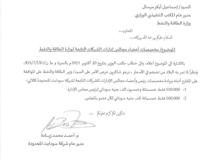 لم يكتفوا بذلك بل قاموا بزيادة قيمة مخصصات رئيس إدارة المجلس الى ٥٥٠،٠٠٠ جنية شهرياً وعضو المجلس الى ٥٠٠،٠٠٠ جنية شهريًا بعد أن كان معظم أعضاء هذه المجالس يعملون كمتطوعين دون أجر طيلة فترة الحكومة الإنتقالية. علماً بأن لائحة وزارة المالية لمجالس إدارات الشركات الحكومية