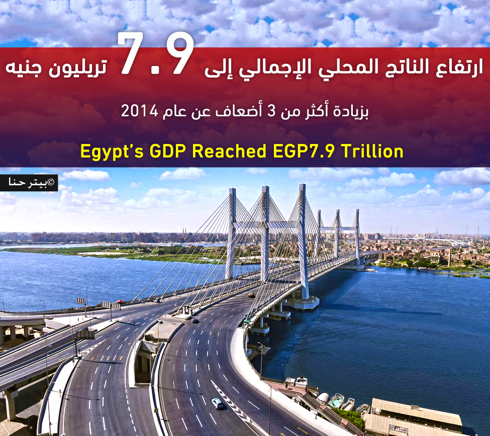 أعلنت الحكومة المصرية ارتفاع الناتج المحلي الإجمالي لمصر خلال العام المالي 2021 – 2022 إلى 7.9 تريليون جنيه (الدولار الأمريكي يعادل 19.25 جنيه مصر).