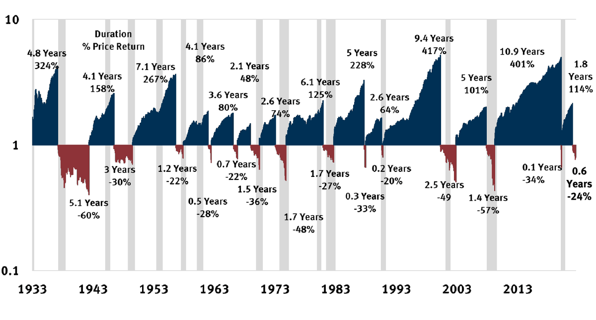 Wykres poniżej przedstawia długość wszystkich bess w porównaniu do postępujących po nich hoss od 100 lat na #sp500. Nigdy nie trafimy w samo dno, ale zwykle prędzej niż później inwestorzy mogli liczyć na nagrodę za swoją żelazną cierpliwość.