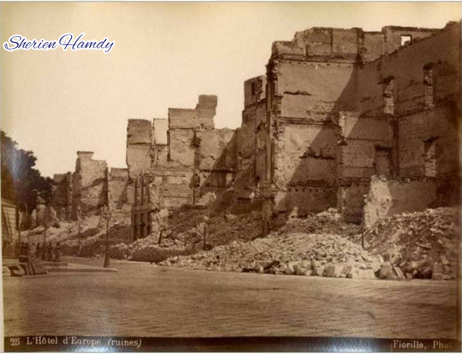 ولم ينجُ سوى مبنين فقط وهما البورصة وكنيسة«سانت مارك»وتمثال محمد على باشا وبعد أعمال مقاومة يائسة اختلطت بأعمال شغب وإحراق لمحال الأجانب نزل الإنجليز وجمعوا عدد كبير من الأهالى وعقدوا محاكمات عسكرية فورية أمام قصر "توسيتزا" أوالبورصة ونصبوا المشانق فى وسط الميدان 👇23