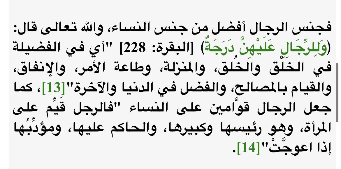 ٥-الأحكام الشرعية الخاصة بالمرأة كالتعدد وتأديب الناشز بالضرب وقوامة الرجل ووجوب طاعته وغيرهامن أحكام يتحرج منها لعدم ملاءمتها للذوق العام، هي أحكام قطعية ثابتة مناسبة لعصرنا ولكل العصور، ولا نشعر بالحرج من أي حكم منها، ولا نخفيها أو نحابي فيها أو نختار التفسيرات الشاذة لتبريرها.