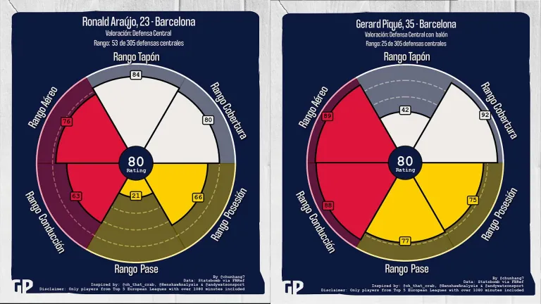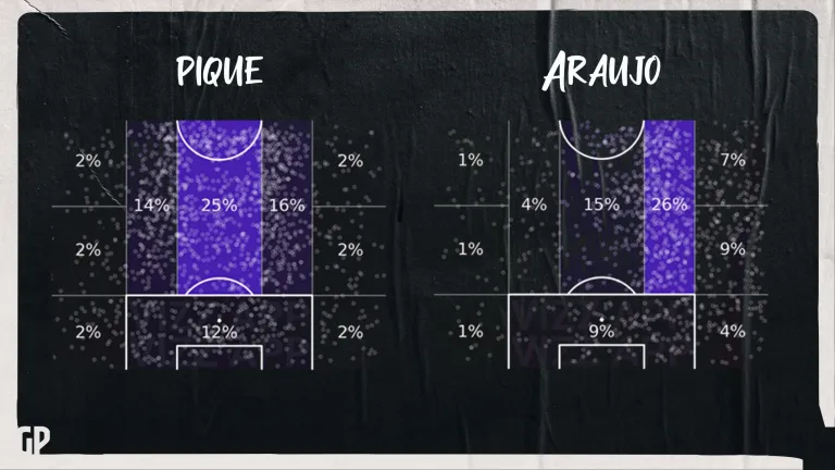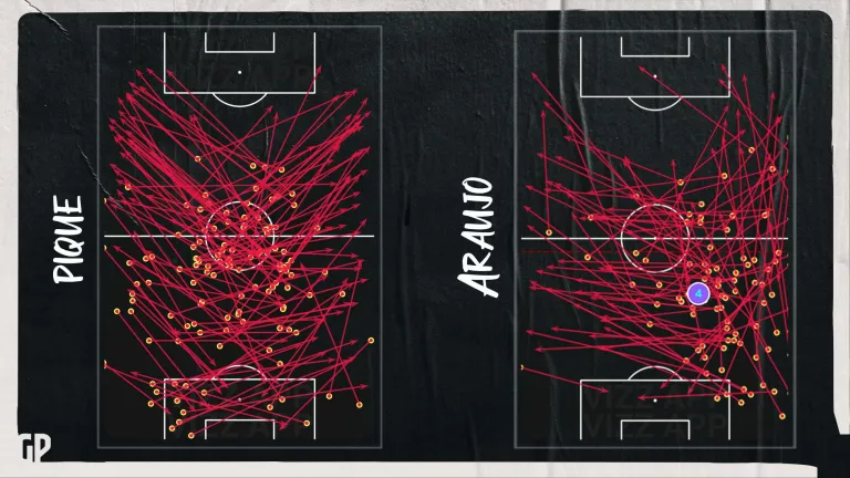 Araujo es potente defensivamente. La temporada pasada realizó de media 1.94 entradas (vs0.95), fue superado el 23.3% de las veces (vs47.7%). En presiones, Araujo también es muy dominante (8.73vs7.07), aunque Piqué es más exitoso (42.1%vs38.6%).