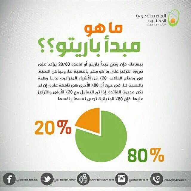 فالاشخاص الاكثر انتاجية يدركون أن 80% من النتائج الأكثر الإيجابية تأتي من 20% فقط من النشاطات الأكثر أهمية، فيركزون على هذه النشاطات الاهم، ويتجاهلون بقية الانشطة قليلة الاهمية والفائدة