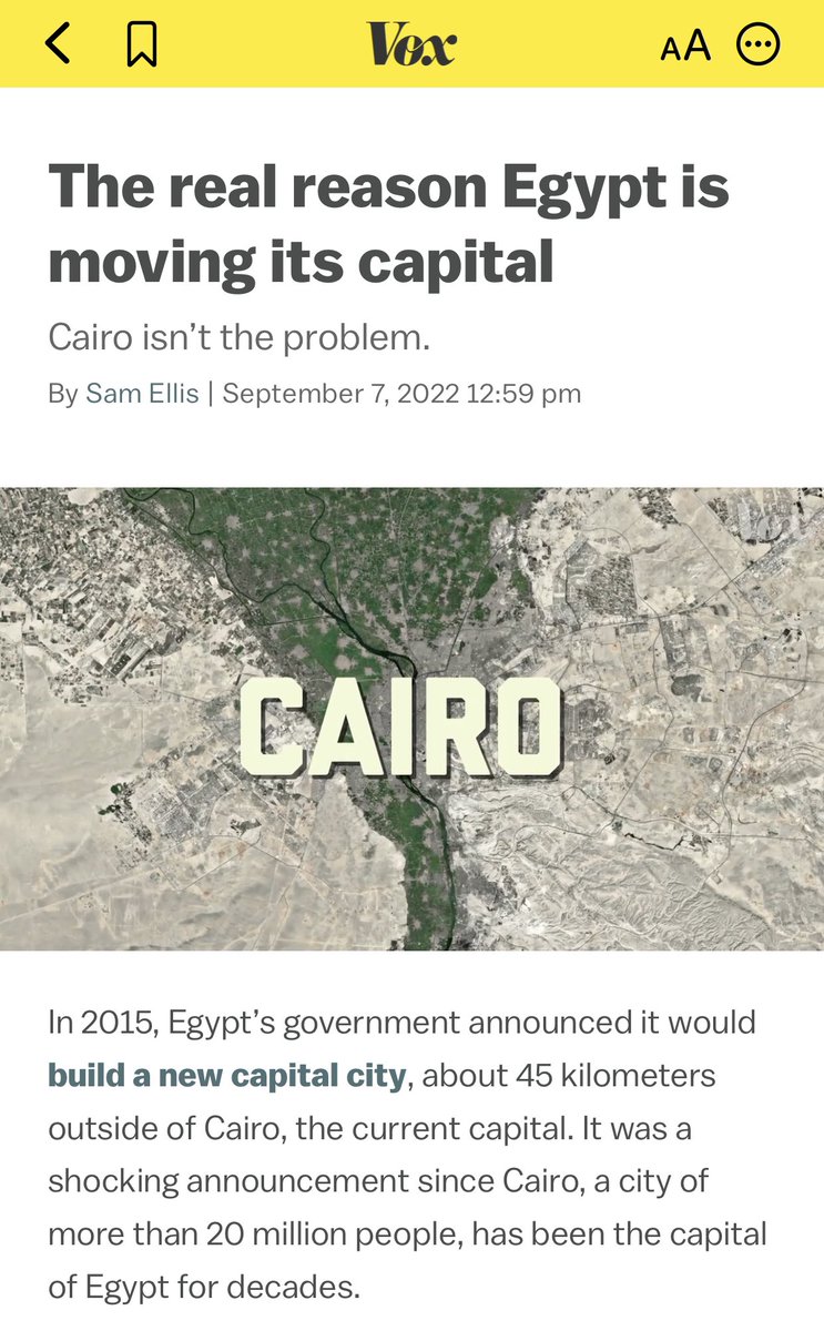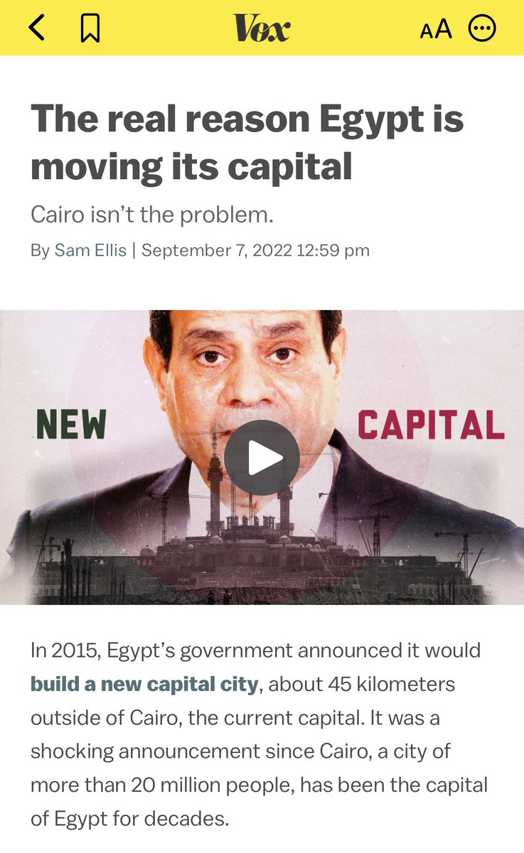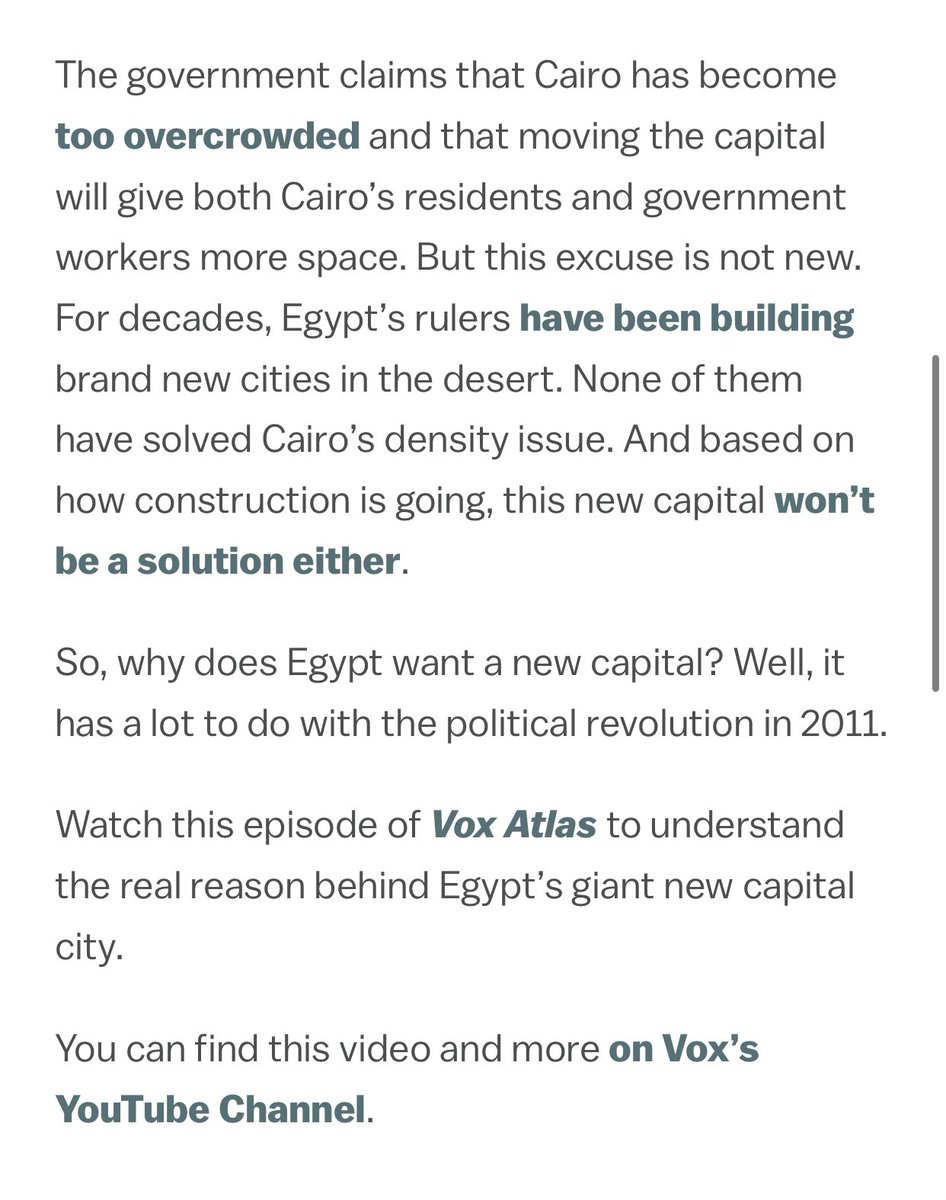 يقول تقرير @voxdotcom أن الفقراء لا يستفيدون ولا يسكنون في المدن الجديدة وأن الهاجس الأمني والخوف من سيناريو ٢٠١١ و ٢٠١٣ هى الأسباب الحقيقية وراء مشروع العاصمة الإدارية الجديدة.