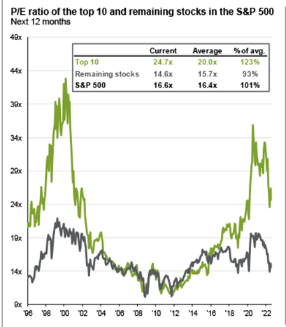 A na tym wykresie widzimy jak istotny wpływ na zachowanie #sp500 ma zaledwie jego 10 największych spółek. Gdyby nie ich udział, można by powiedzieć, że wyceny wróciły już do całkiem przyzwoitych poziomów.