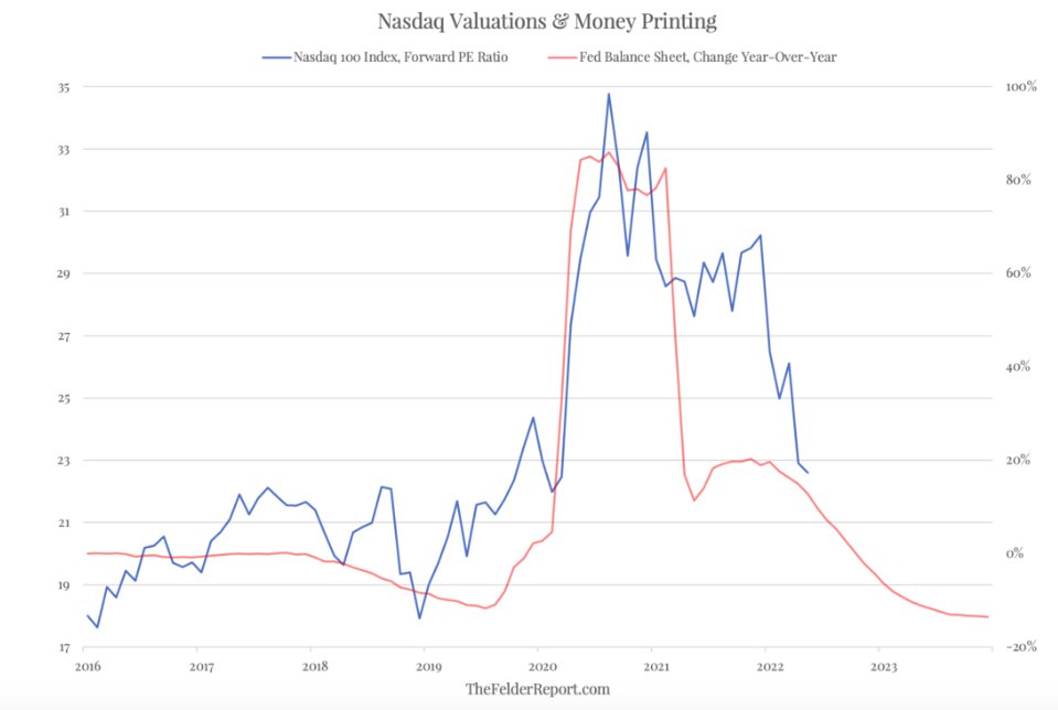 Zatem czy jesteśmy właśnie w kolejnej bańce technologicznej? W 2000 roku wskaźnik cena/zysk na #nasdaq sięgał 175, obecnie jest to zaledwie 27. Jednak poniższy wykres wskazuje jak wielki wpływ na prognozowany wzrost spółek tego indeksu ma tani pieniądz w obiegu.