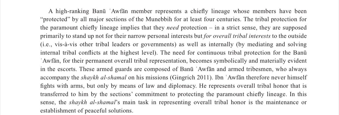 ▪️ تحدث أندريه غنيغريش عن (آل عوفان) ومكانتهم القبلية في بني منبه وأن جميع قبائل منبه تحميهم؛ لأنهم هم شيوخ شمل بني منبه وهم شرف القبيلة-على حد وصفه- وهم مقدمي قبيلتهم، وأن الشيخ من آل عوفان لايهتم لمصالحه الشخصية بل يهتم بكل مايخص القبيلة ومصالحها داخليًا وخارجيًا.