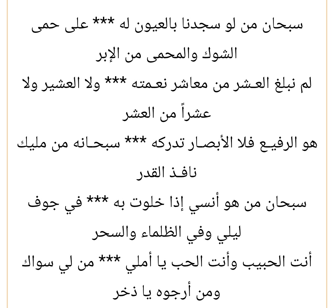 نعمة الشرع و الشريعة، الحمد لله على نعمة العقيدة الراسخة، الحمد لله على نعمة النفوس المطمئنة، الحمد لله على نعمة السكينة و حلق الذكر و صلة الرحم، الحمد لله على رمضان و الصيام و القيام و العمرة و الحج، الحمد لله على نعمة الإيمان بأركانه، الحمد لله على نعمة الإيمان بالله =