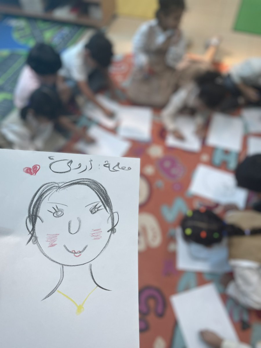 - كل طفل يرسم نفسه ( بعد النظر الى المرآة ) سترون براءة الاطفال و تقبلهم لذواتهم و للاختلاف ، ستسمعون حوارات شيقة عن مايميزهم ) و الاجمل المفردات و المفاهيم الجديدة : ابيض و اسمر و قمحي و املس و اجعد و طويل و قصير سمين و نحيف ✨👏🏻