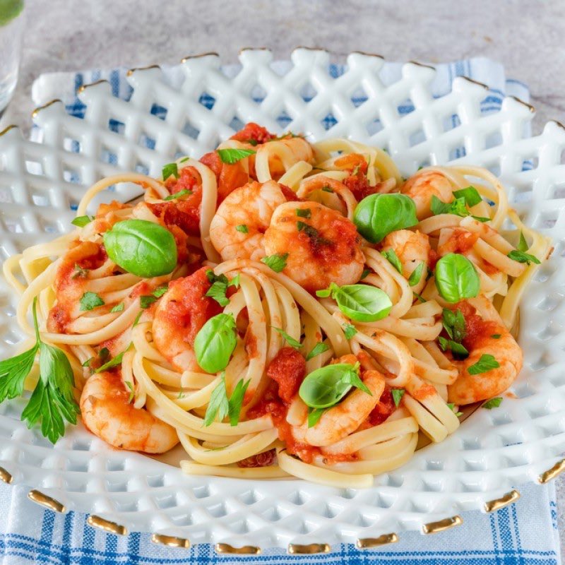 مكرونة لينجويني بالجمبري وصلصة الطماطم