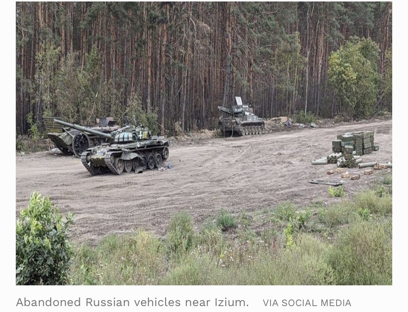 4-رغم كثافة القصف الروسي الا ان خسائره على الارض تستمر في التصاعد والأسوأ هو استيلاء الجيش الاوكراني على معدات الجيش الروسي المنسحب حيث تم الاستيلاء في الأسبوع ونصف الأسبوع الماضيين فقط على ما يكفي من الدبابات والمركبات القتالية والمدفعية الروسية لتجهيز لواء بأكمله بحسب BBC
