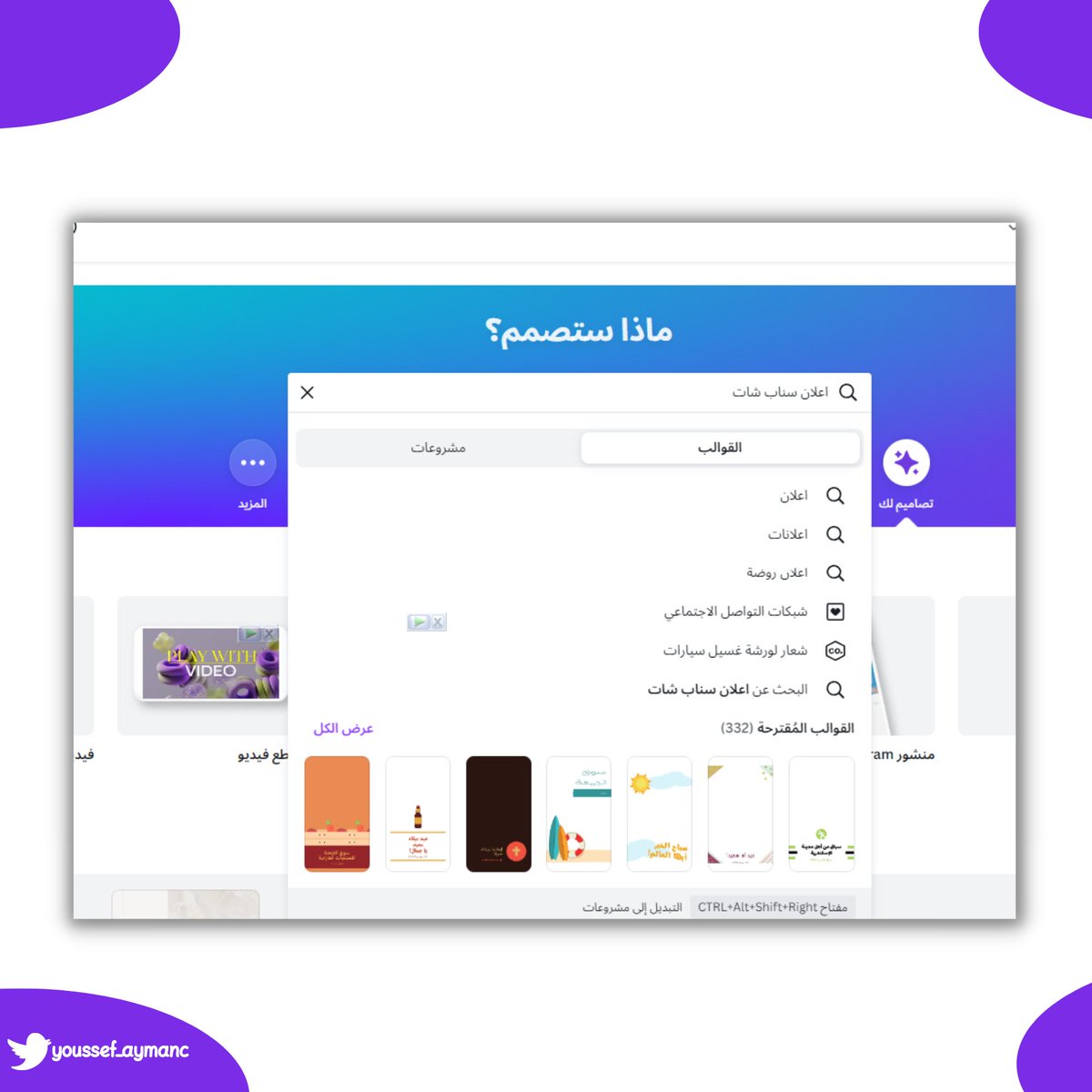اولاً يا صديقي ،مين انا ؟ انا يوسف ايمن ، قررت اصنع محتوى في حسابي متخصص في منصة كانفا واساعد المتابعين يتعلمون كانفا عن طريق ثريدات ودورات تدربية ،حتى الآن دربت اكثر من 250 شخص في منصة كانفا واتطمح اوصل الى 500 شخص مع نهاية السنة 💪💜