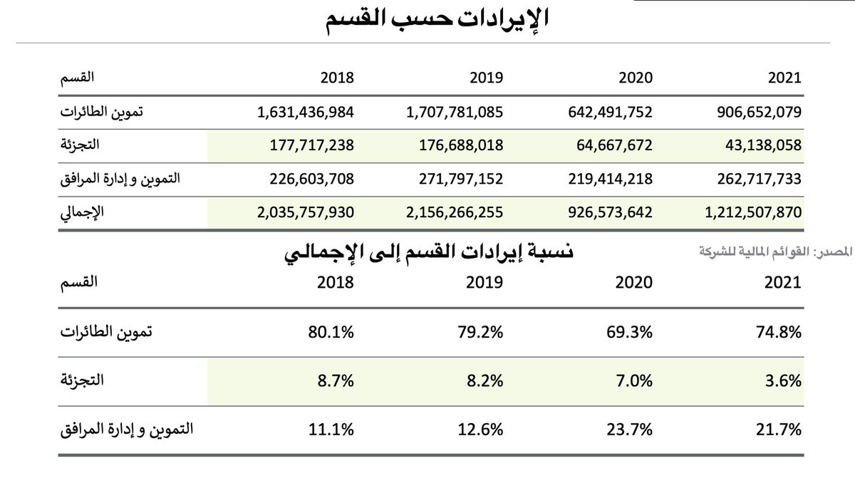 • و مع ظهور الجائحة انخفضت نسبة إيرادات تموين الطائرات الى ٦٩٪ من اجمالي الإيرادات و ارتفعت نسبة تموين و إدارة المرافق إلى ٢٣.٧٪ من إجمالي الإيرادات، و هذا يشير إلى توسع الشركة في التموين خارج نطاق النقل الجوي.