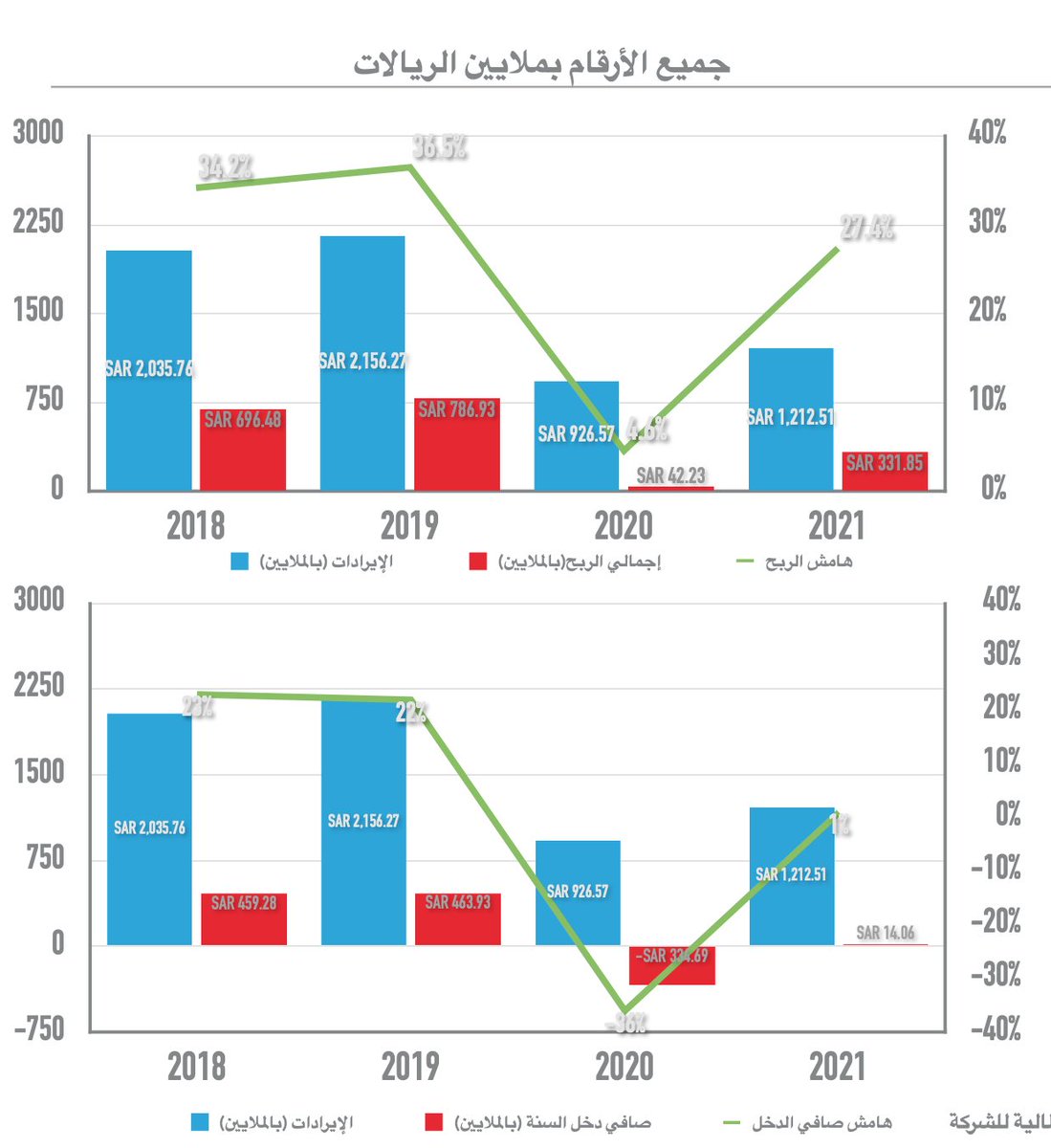 وفي العام ٢٠٢١ بدأت الشركة بالتعافي حيث وصل التدفق النقدي الحر إلى ٣٣٧.٥٤٣ مليون ريال، وهذا مقارب للعام ٢٠١٨، هذه إشارة إلى أن الشركة تعافت بسرعة من آثار الجائحة التي أثرت سلبًا على أداء الشركة في عام ٢٠٢٠.